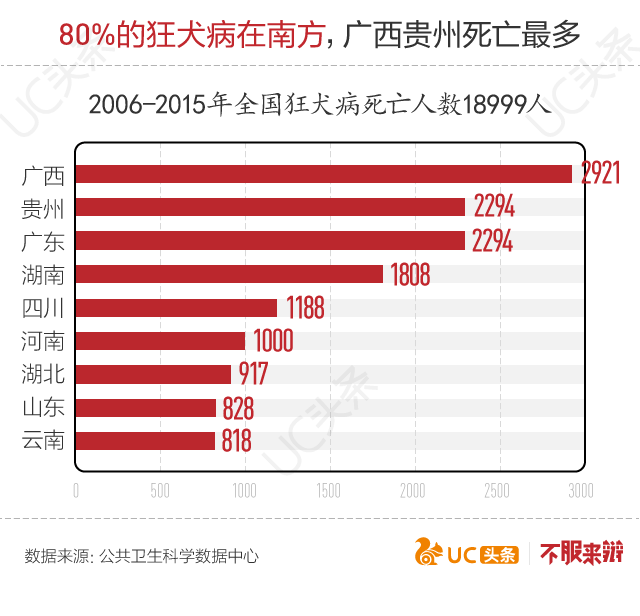 中国狂犬病主要分布在南方,一方面与人口密度和气候有关,另一方面因为南方比北方更爱养狗。比如广西和贵州两地,吃狗肉文化盛行,狗的数量不少,因此一直是中国狂犬病死亡人数最多的两地。排名第三的广东虽然对狗肉没有特殊的癖好,却是全国最爱养宠物的地区。《中国宠物市场调查研究报告》称,广东宠物数量时候全国的10.62%,乃全国第一宠物大省。