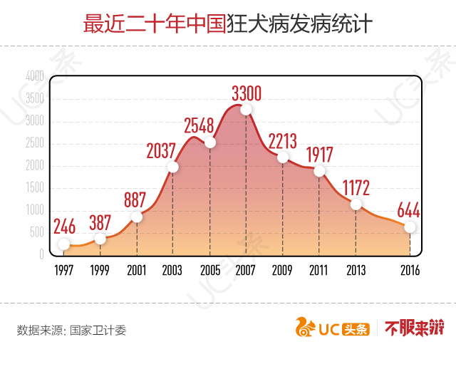 狂犬病的死亡率极高,一旦染上致死率接近100%。来自中国卫计委的数据显示,从1950至2016年年底,中国(港澳台除外)已有13万人因感染狂犬病丧生,平均每年的死亡病例约为2000人,是除印度外死亡人数最多的国家。