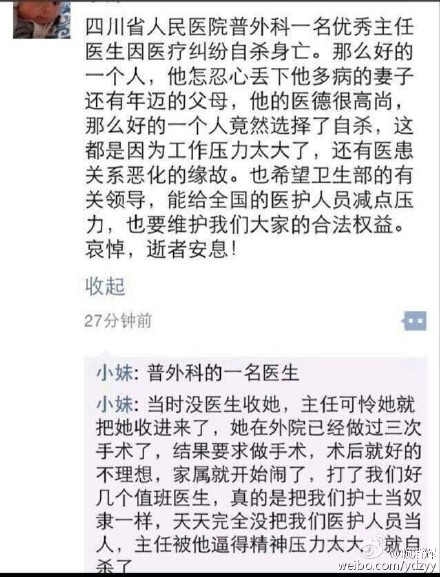 3月31日晚,四川多位医生在网络爆料称,四川省人民医院医生周晓辉因医疗纠纷自杀身亡。
