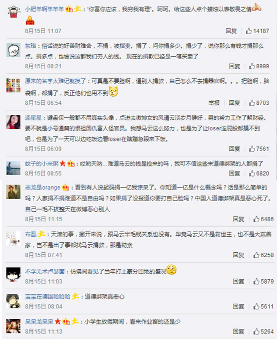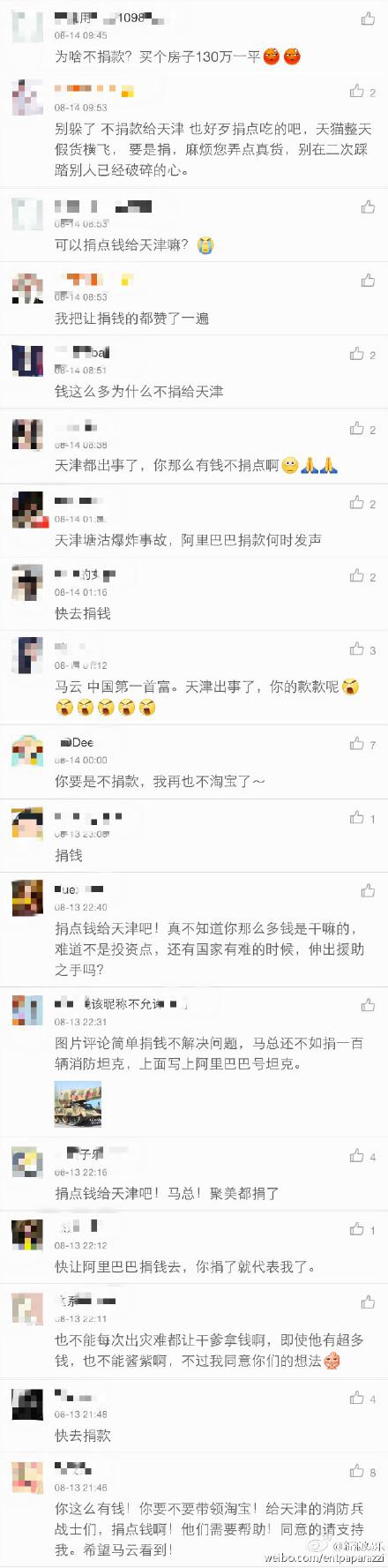 自8月12日天津塘沽爆炸发生以来,各界人士发动爱心捐款对其进行援助,而阿里巴巴董事局主席马云的动静成为媒体和网友关注的焦点。目前,马云微博已沦陷,最后一条微博下面被清一色的“逼捐款”留言所覆盖。网友截图马云微博评论:“你那么有钱为什么不给天津捐款”,“首富就应该捐1个亿”,“你捐了就等于我捐了”,“你不捐款,我再也不淘宝了”等强迫性质的捐款留言。