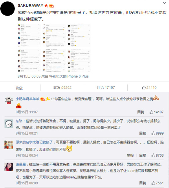 有网友被如此“逼捐”架势吓呆,通过微博称:“我被马云微博评论里的“逼捐”的吓呆了。知道这世界有XX,但没想到已经都不要脸到这种程度了。”