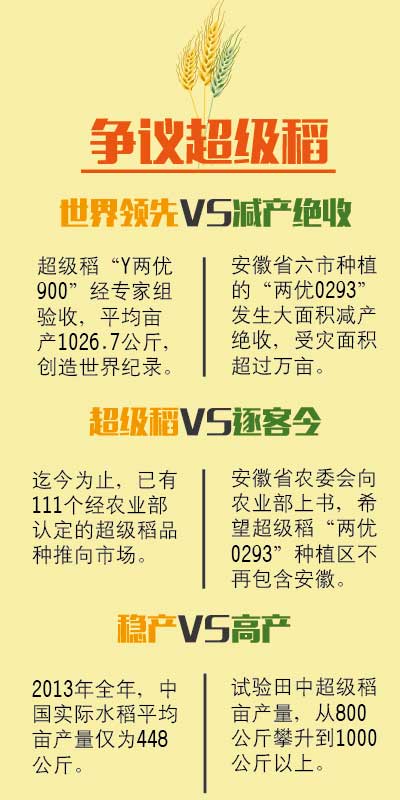 19年来,超级稻试验产量高歌猛进,中国稻谷总产量和单产却未见显著提高。2013年,中国实际水稻平均亩产量仅为447.8公斤,与1000公斤的试验水平相去甚远。隆平高科的超级稻在安徽出现大面积绝收,再度引发农业界对“重产量不重质量”的反思。